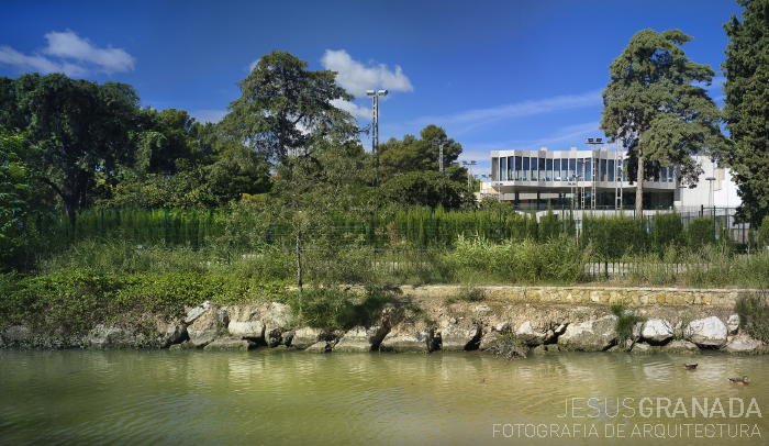 La construcción se resuelve con una ajustada elección de materiales: aluminio para las fachadas, en bandejas o en celosía, vidrio y madera para las carpinterías, y hormigón in-situ para el zócalo y plaza.