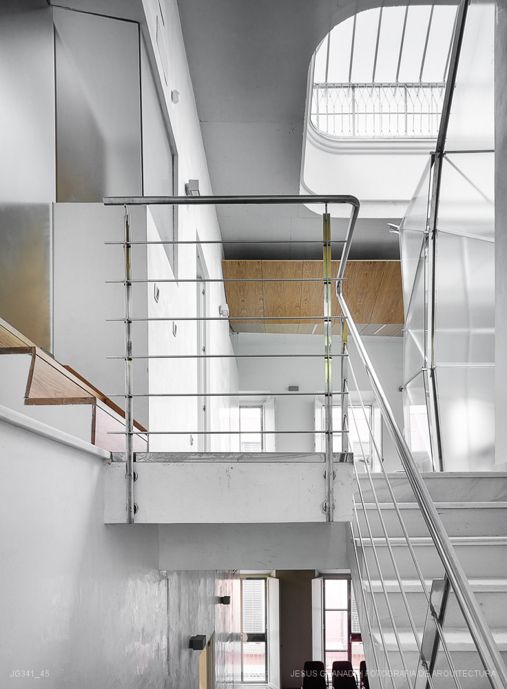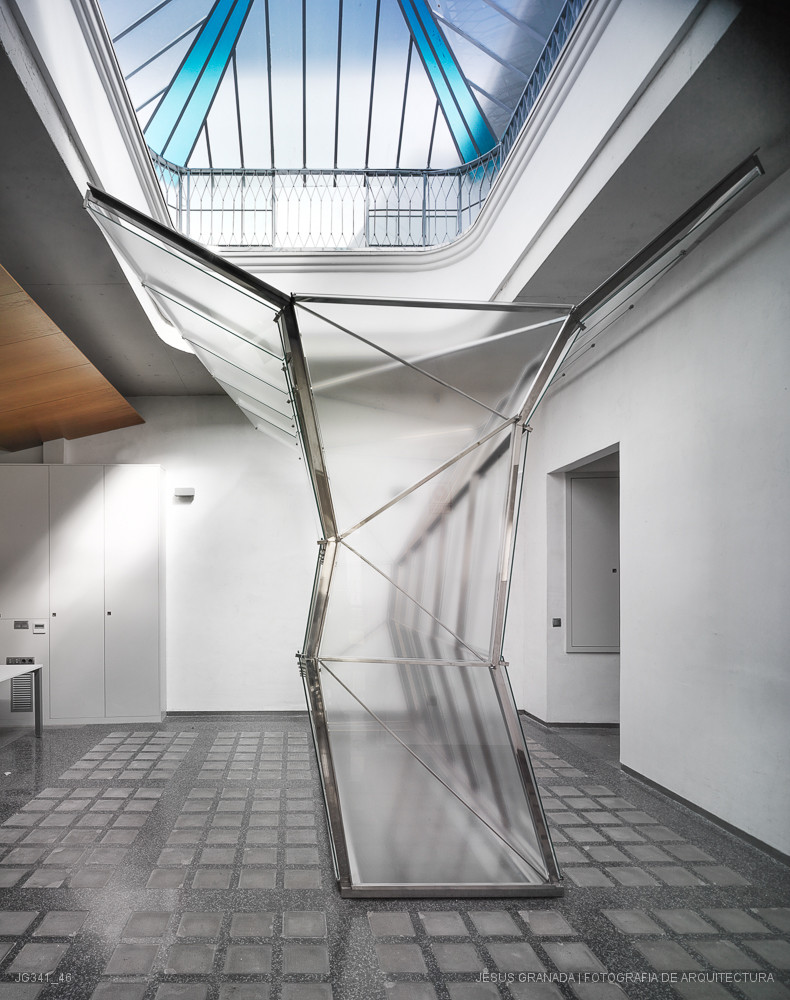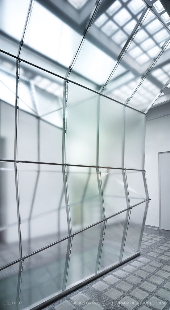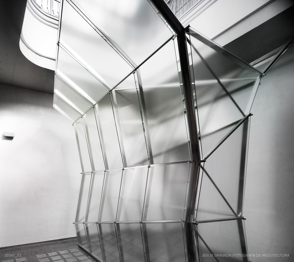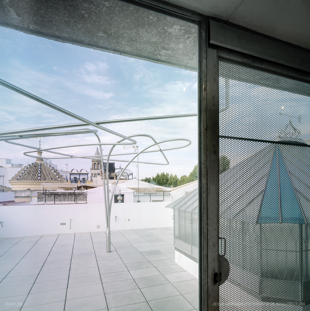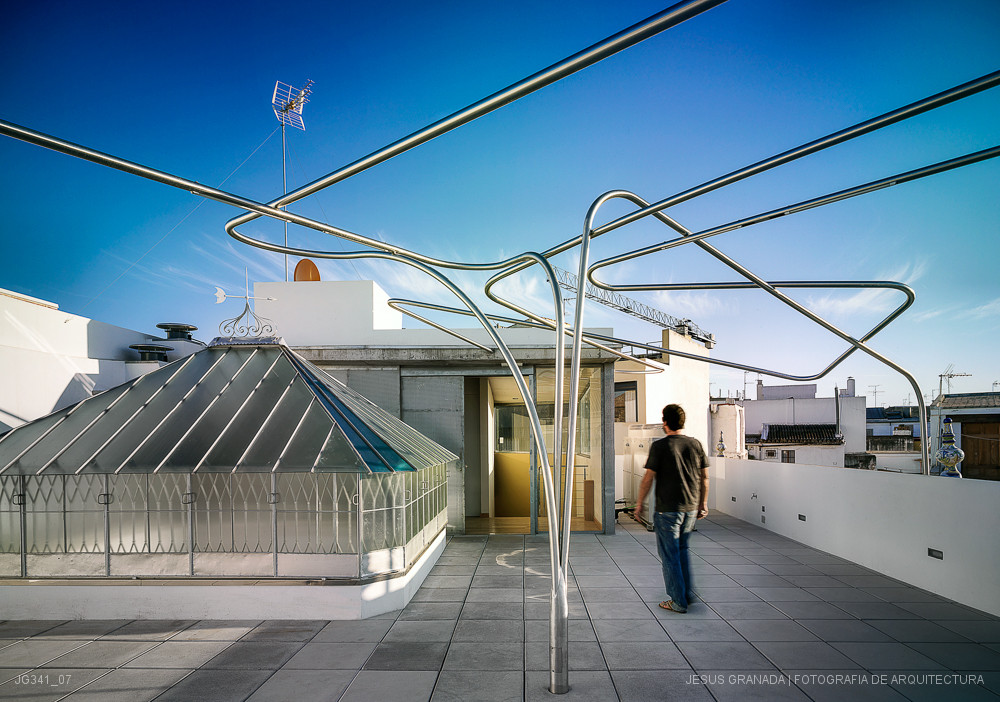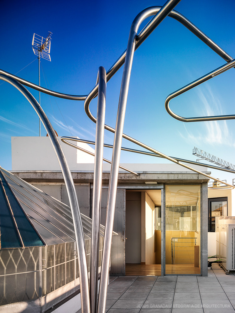 En las plantas superiores, cosidas en un sentido común por la lámpara (lucernario vertical) que recupera la dimensión y sentido original del patio, se redistribuye –en las crujías perimetrales que conforman el contenedor- el espacio necesario para ser ocupado por el personal asignado a cada Fundación. En los vacíos que quedan, surgen los lugares de posibilidad para otros encuentros esporádicos, formativos, reivindicativos. Así, hasta llegar a la planta de cubierta, la azotea, recreada como habitación abierta a los techos de la ciudad, aludiendo a una tradición capaz de convocar a la vieja montera de vidrio o a la pérgola de acero, soporte de una sombra necesaria para su acondicionamiento ambiental o de una vegetación siempre presente en estos planos de lo lúdico y contingente.