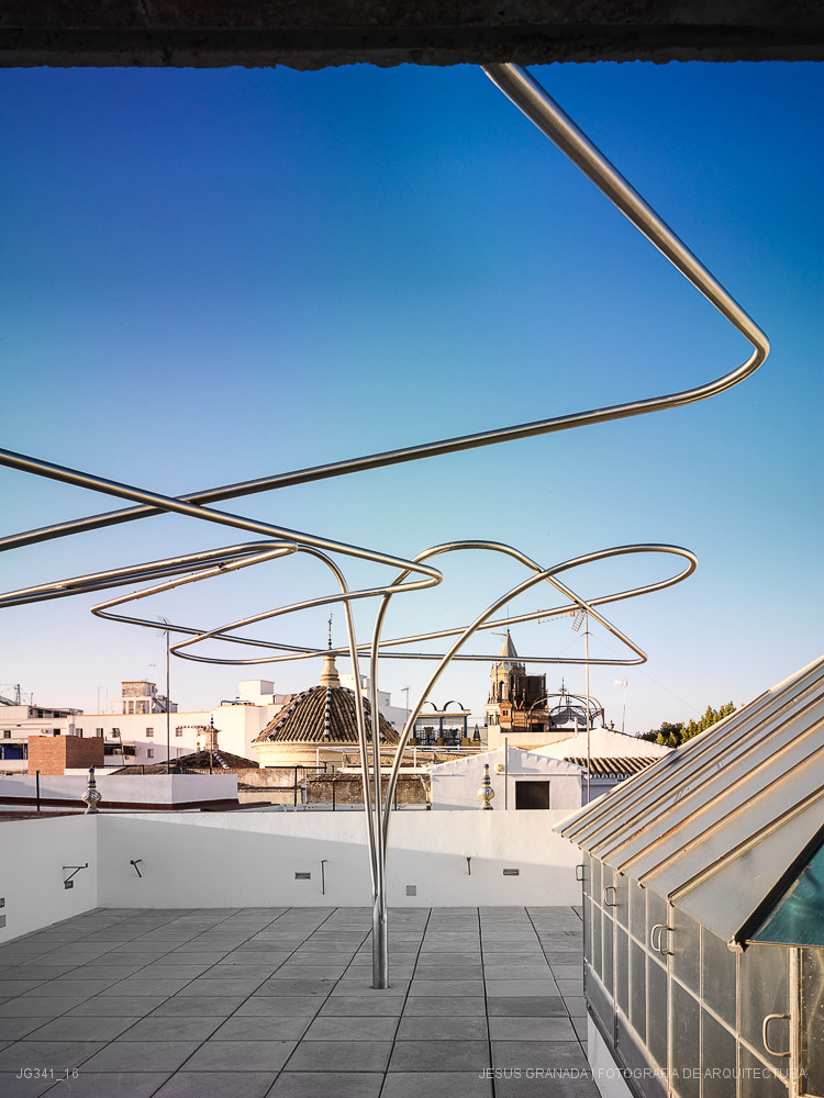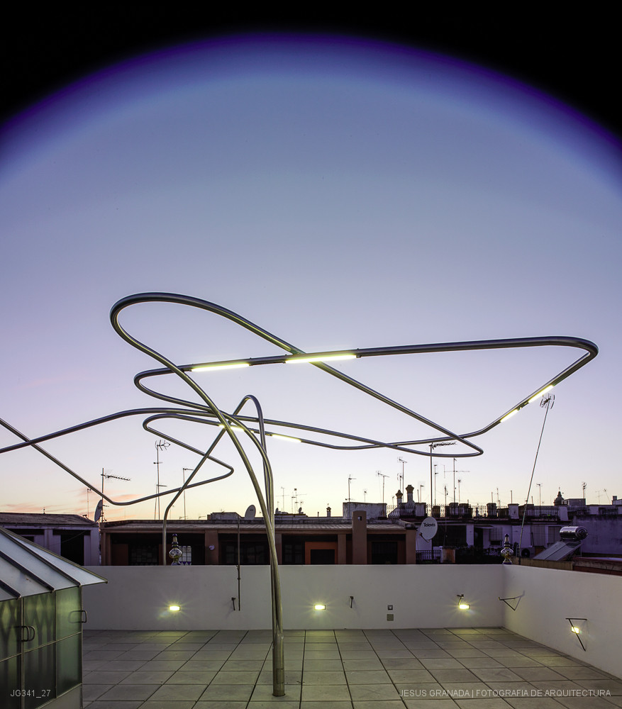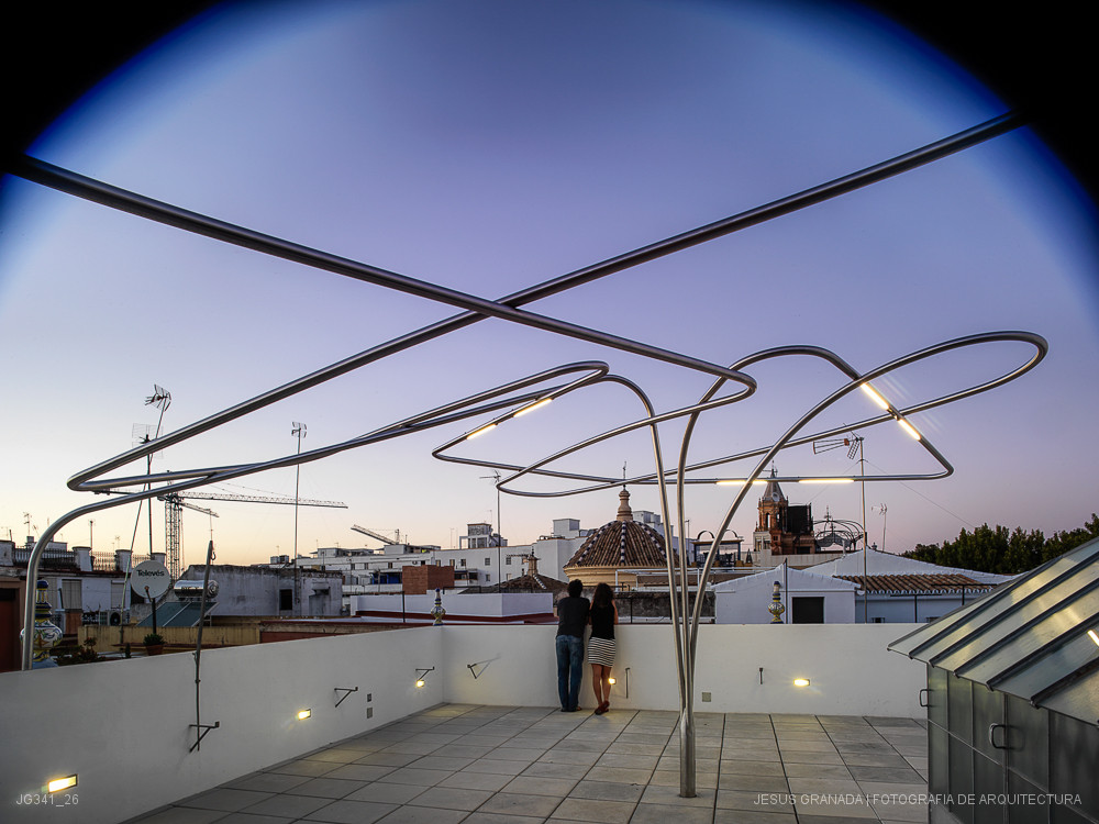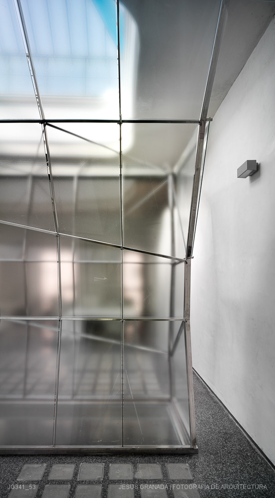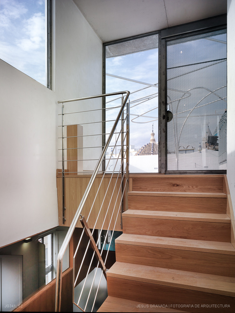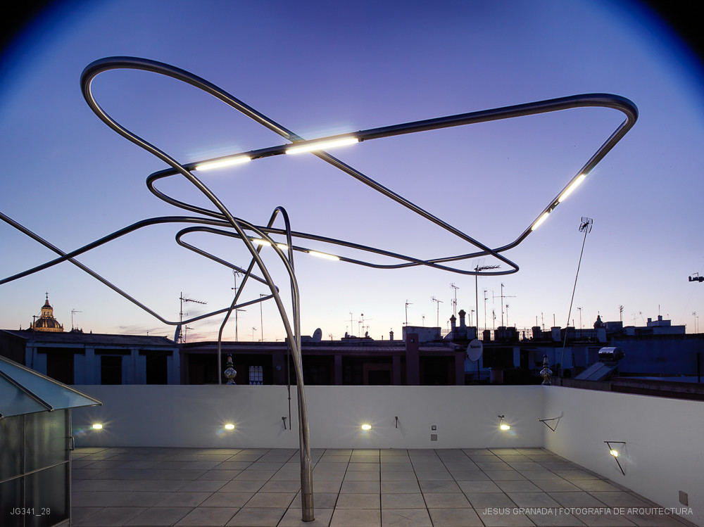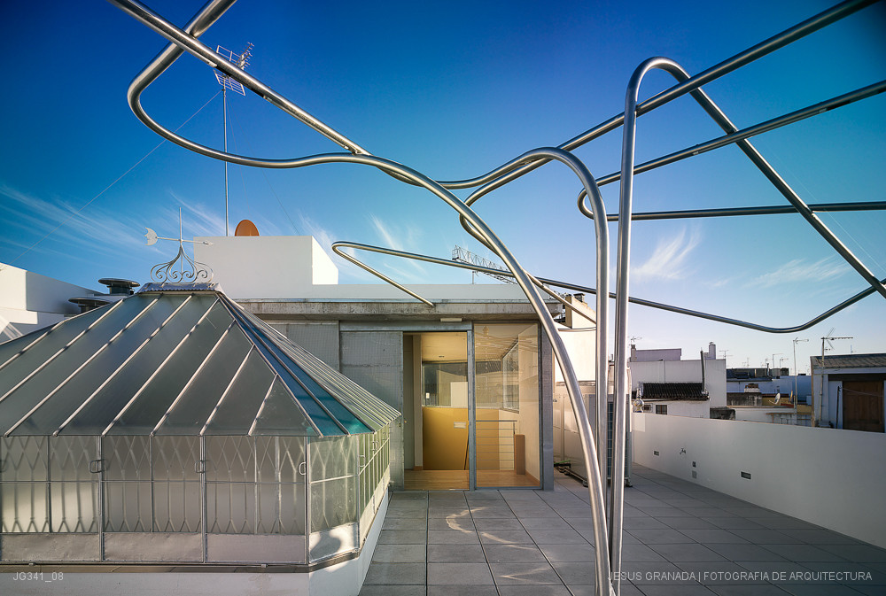 En las plantas superiores, cosidas en un sentido común por la lámpara (lucernario vertical) que recupera la dimensión y sentido original del patio, se redistribuye –en las crujías perimetrales que conforman el contenedor- el espacio necesario para ser ocupado por el personal asignado a cada Fundación. En los vacíos que quedan, surgen los lugares de posibilidad para otros encuentros esporádicos, formativos, reivindicativos. Así, hasta llegar a la planta de cubierta, la azotea, recreada como habitación abierta a los techos de la ciudad, aludiendo a una tradición capaz de convocar a la vieja montera de vidrio o a la pérgola de acero, soporte de una sombra necesaria para su acondicionamiento ambiental o de una vegetación siempre presente en estos planos de lo lúdico y contingente.