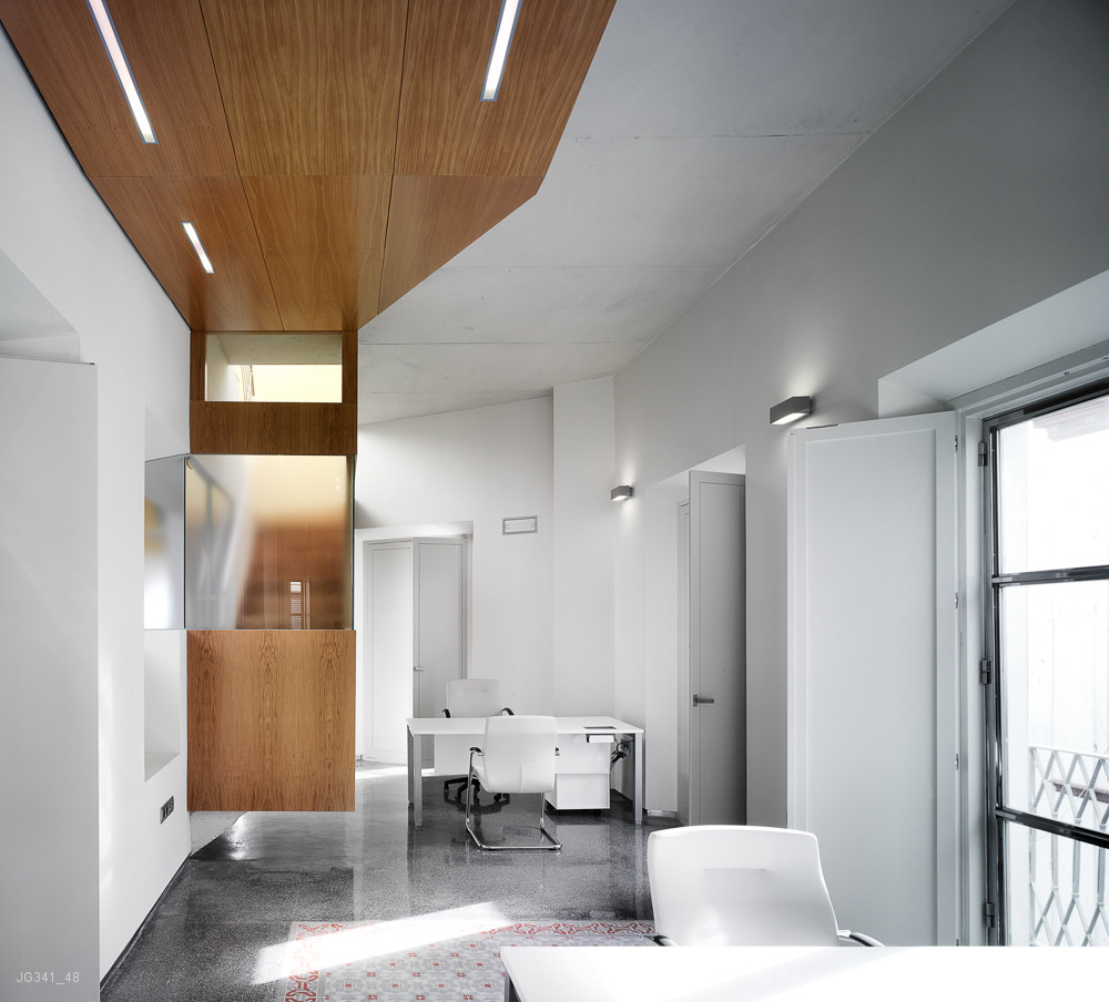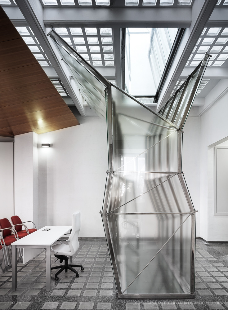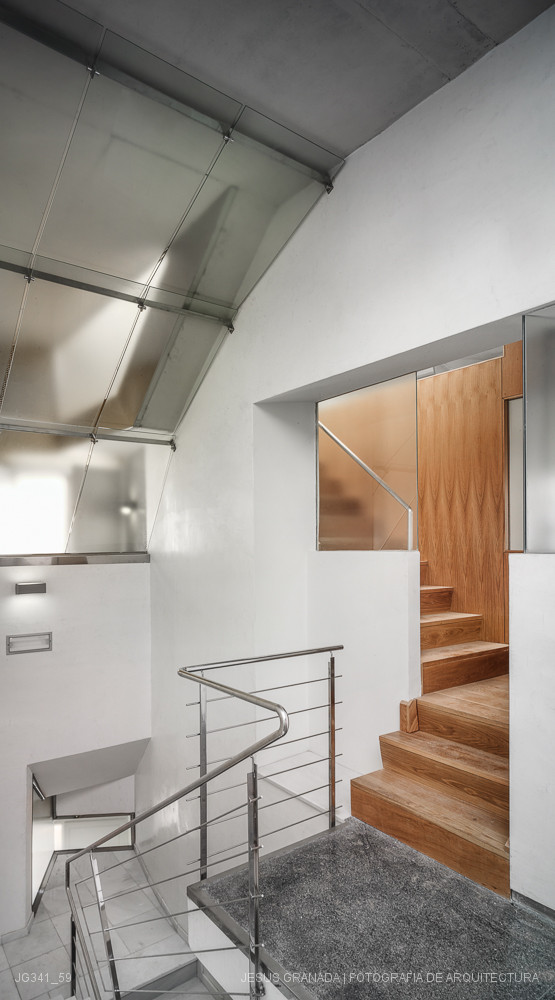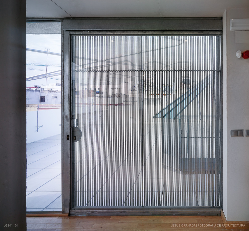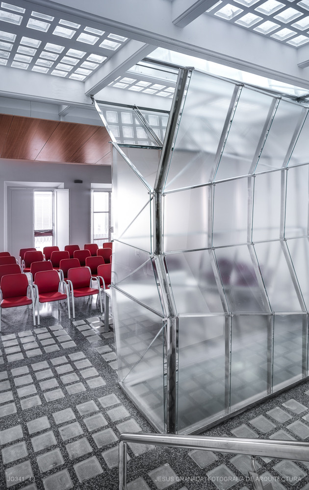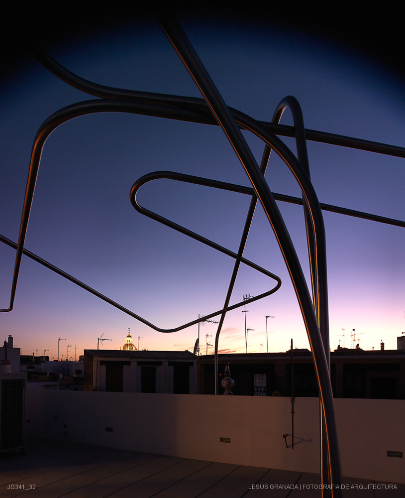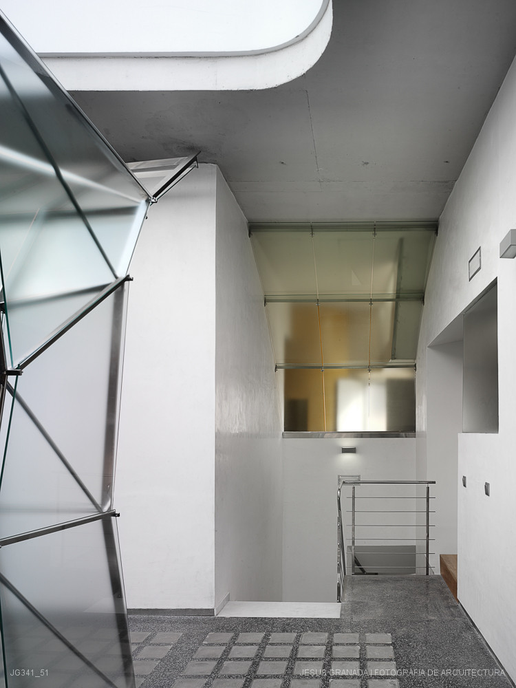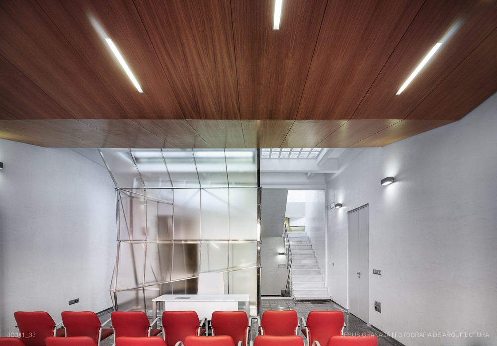 En las plantas superiores, cosidas en un sentido común por la lámpara (lucernario vertical) que recupera la dimensión y sentido original del patio, se redistribuye –en las crujías perimetrales que conforman el contenedor- el espacio necesario para ser ocupado por el personal asignado a cada Fundación. En los vacíos que quedan, surgen los lugares de posibilidad para otros encuentros esporádicos, formativos, reivindicativos. Así, hasta llegar a la planta de cubierta, la azotea, recreada como habitación abierta a los techos de la ciudad, aludiendo a una tradición capaz de convocar a la vieja montera de vidrio o a la pérgola de acero, soporte de una sombra necesaria para su acondicionamiento ambiental o de una vegetación siempre presente en estos planos de lo lúdico y contingente.