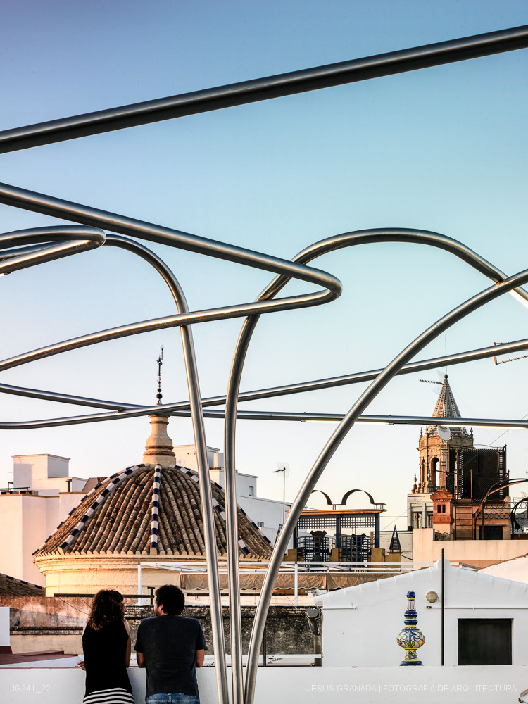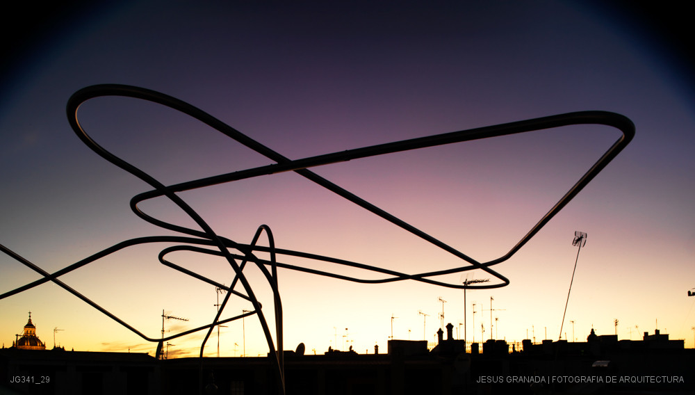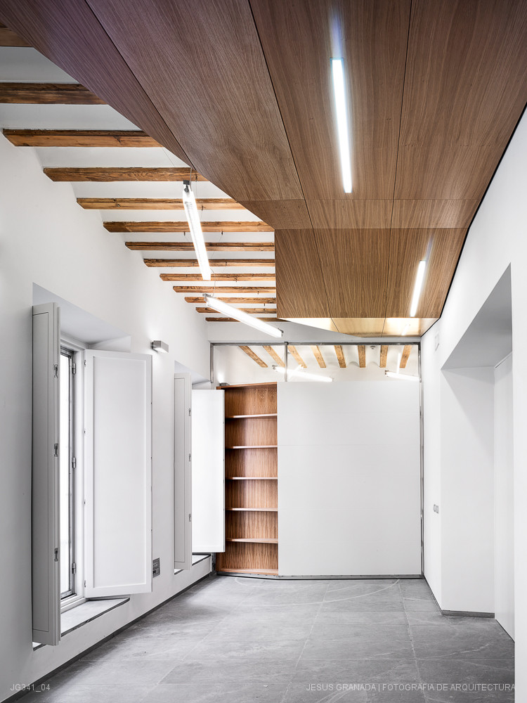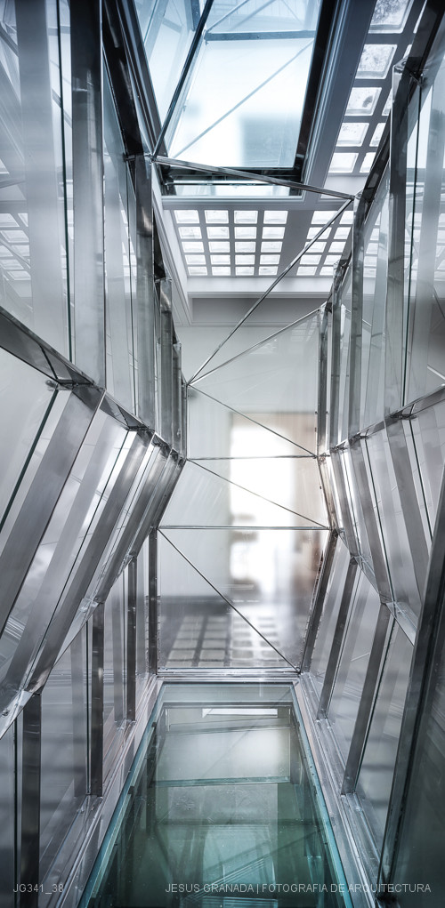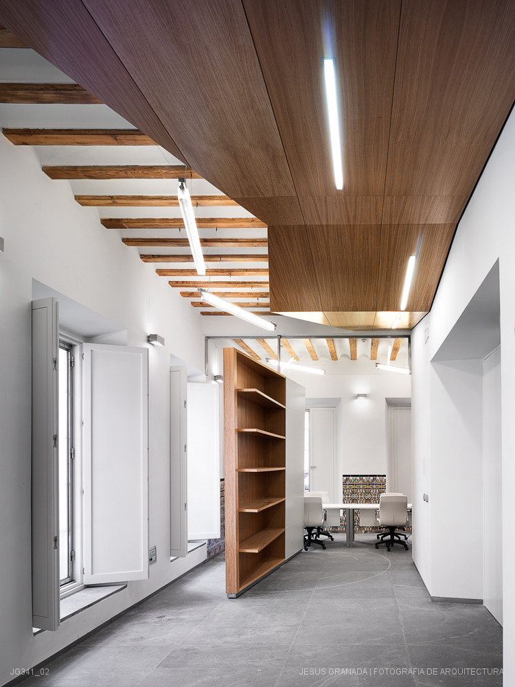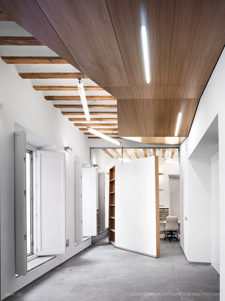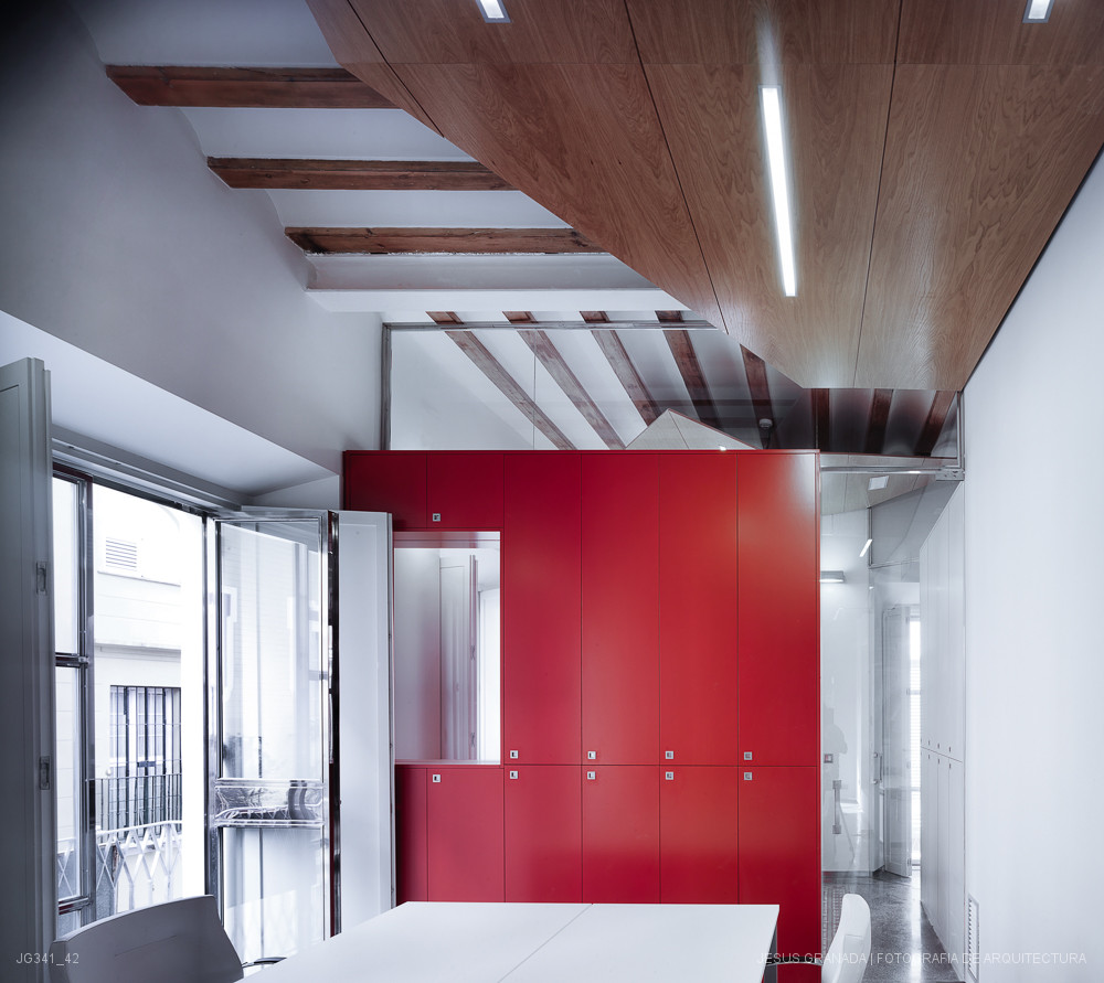 En las plantas superiores, cosidas en un sentido común por la lámpara (lucernario vertical) que recupera la dimensión y sentido original del patio, se redistribuye –en las crujías perimetrales que conforman el contenedor- el espacio necesario para ser ocupado por el personal asignado a cada Fundación. En los vacíos que quedan, surgen los lugares de posibilidad para otros encuentros esporádicos, formativos, reivindicativos. Así, hasta llegar a la planta de cubierta, la azotea, recreada como habitación abierta a los techos de la ciudad, aludiendo a una tradición capaz de convocar a la vieja montera de vidrio o a la pérgola de acero, soporte de una sombra necesaria para su acondicionamiento ambiental o de una vegetación siempre presente en estos planos de lo lúdico y contingente.