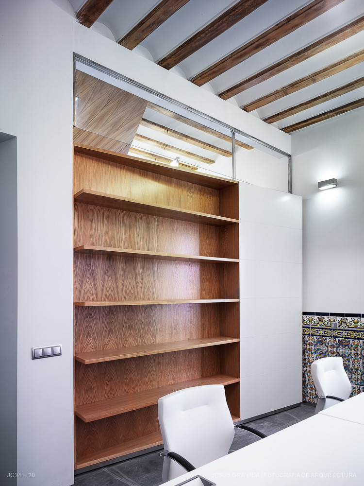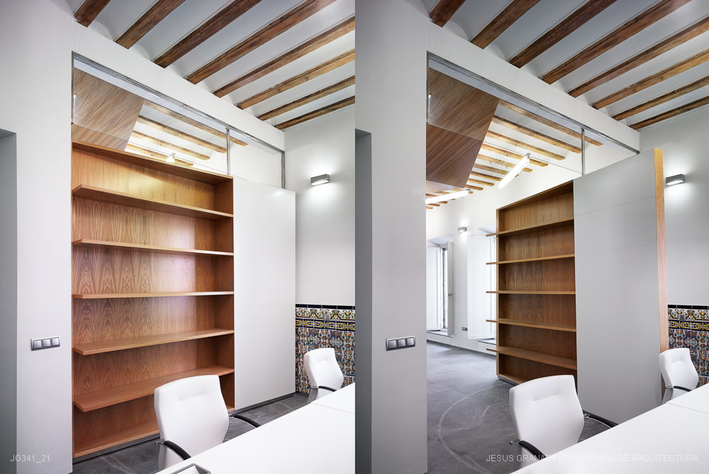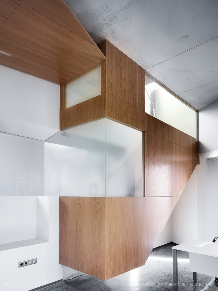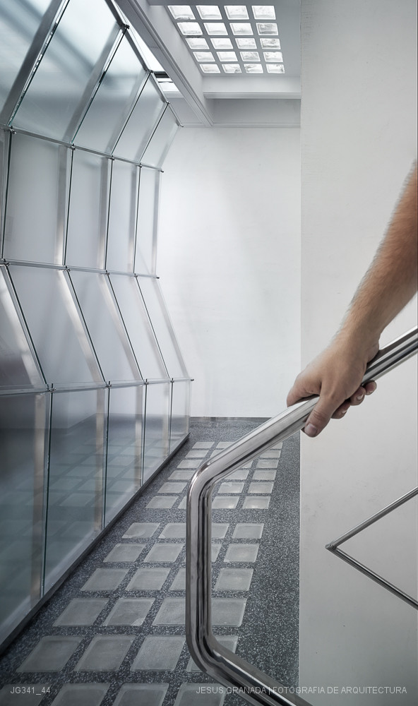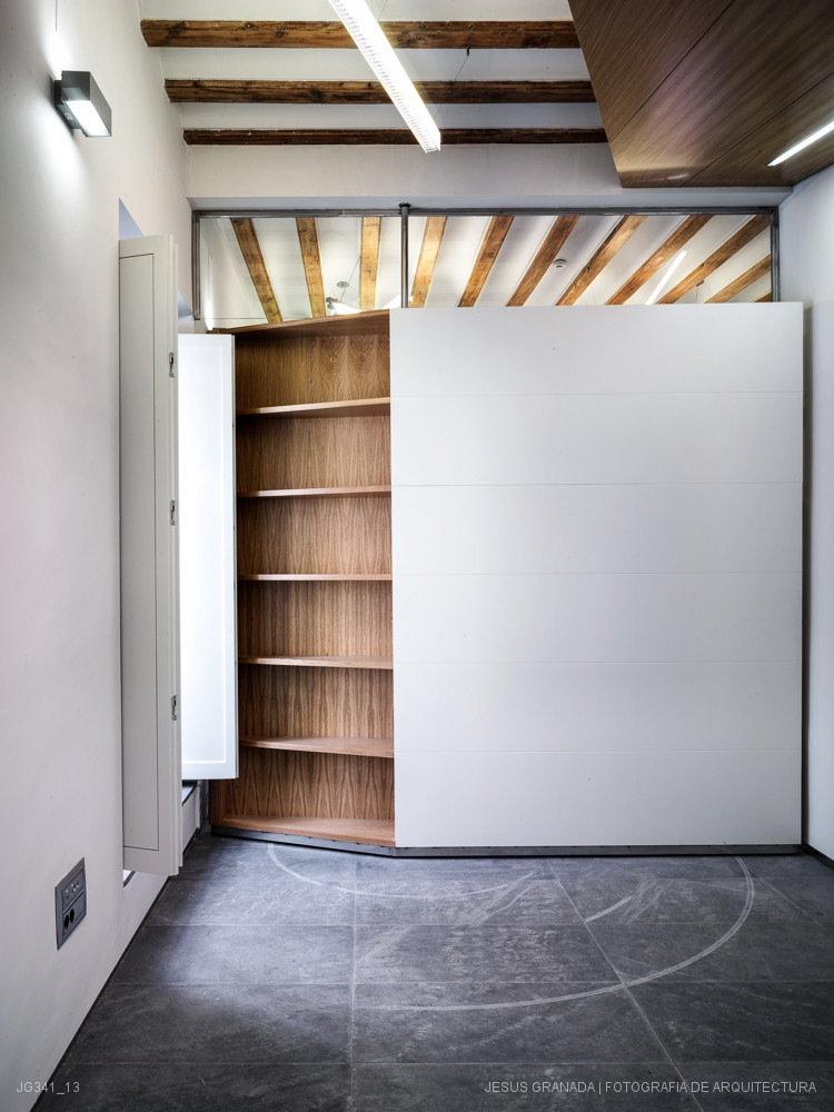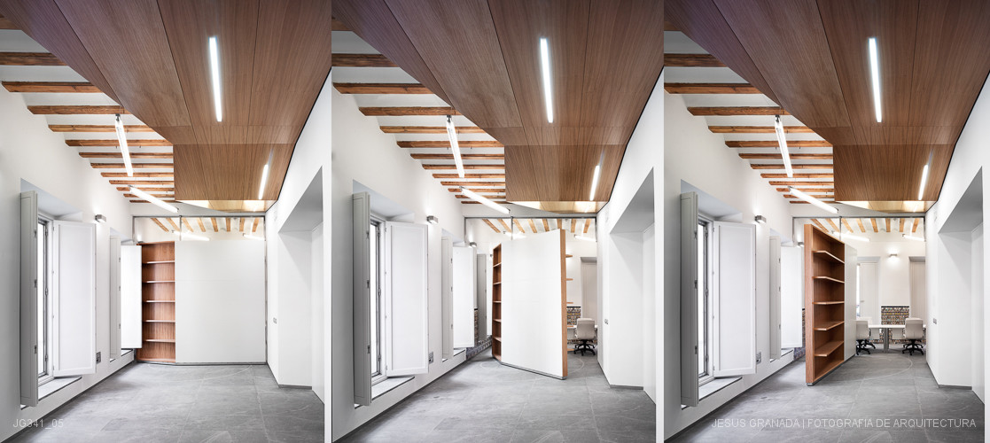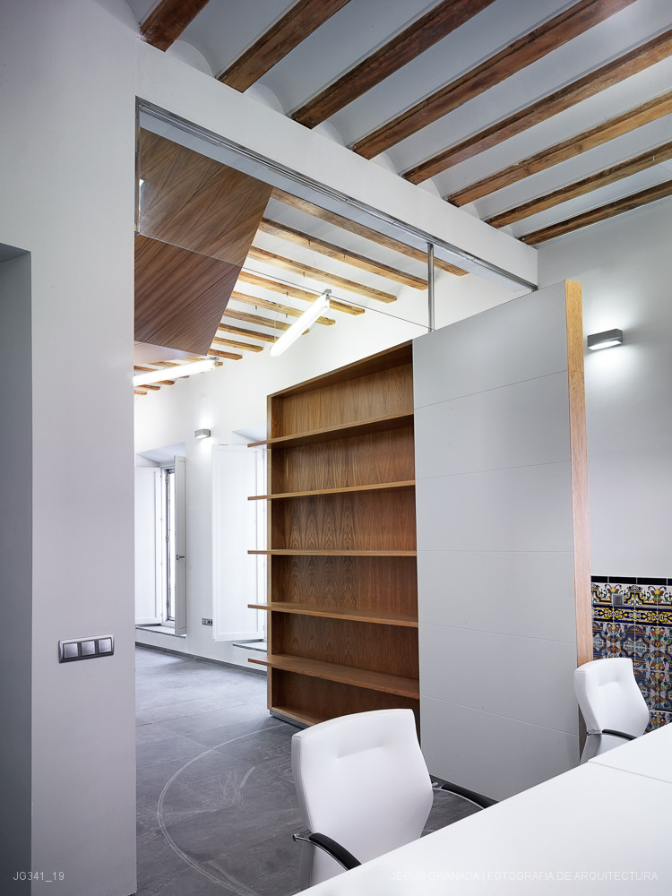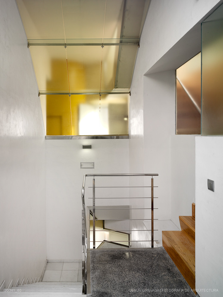 En las plantas superiores, cosidas en un sentido común por la lámpara (lucernario vertical) que recupera la dimensión y sentido original del patio, se redistribuye –en las crujías perimetrales que conforman el contenedor- el espacio necesario para ser ocupado por el personal asignado a cada Fundación. En los vacíos que quedan, surgen los lugares de posibilidad para otros encuentros esporádicos, formativos, reivindicativos. Así, hasta llegar a la planta de cubierta, la azotea, recreada como habitación abierta a los techos de la ciudad, aludiendo a una tradición capaz de convocar a la vieja montera de vidrio o a la pérgola de acero, soporte de una sombra necesaria para su acondicionamiento ambiental o de una vegetación siempre presente en estos planos de lo lúdico y contingente.