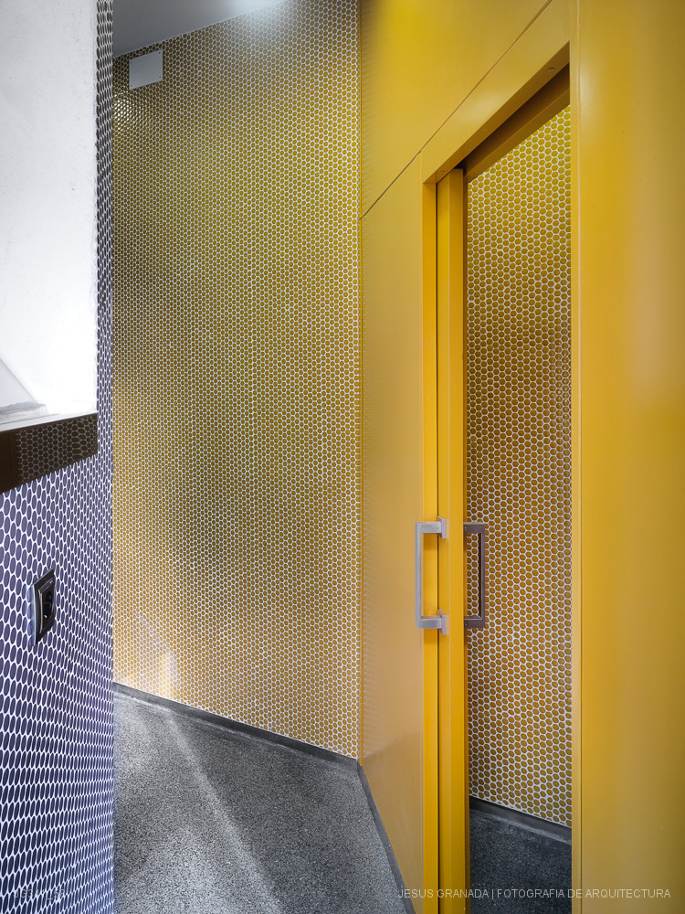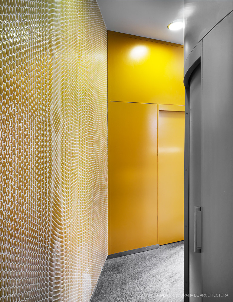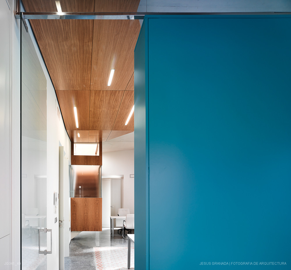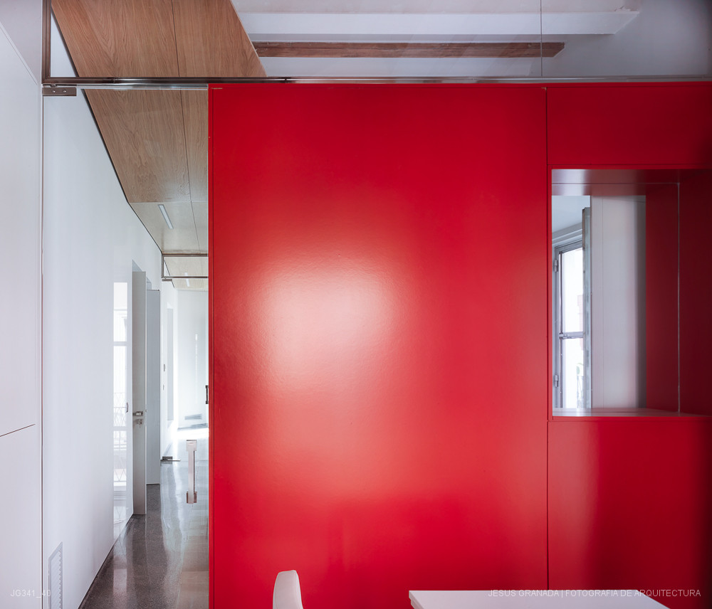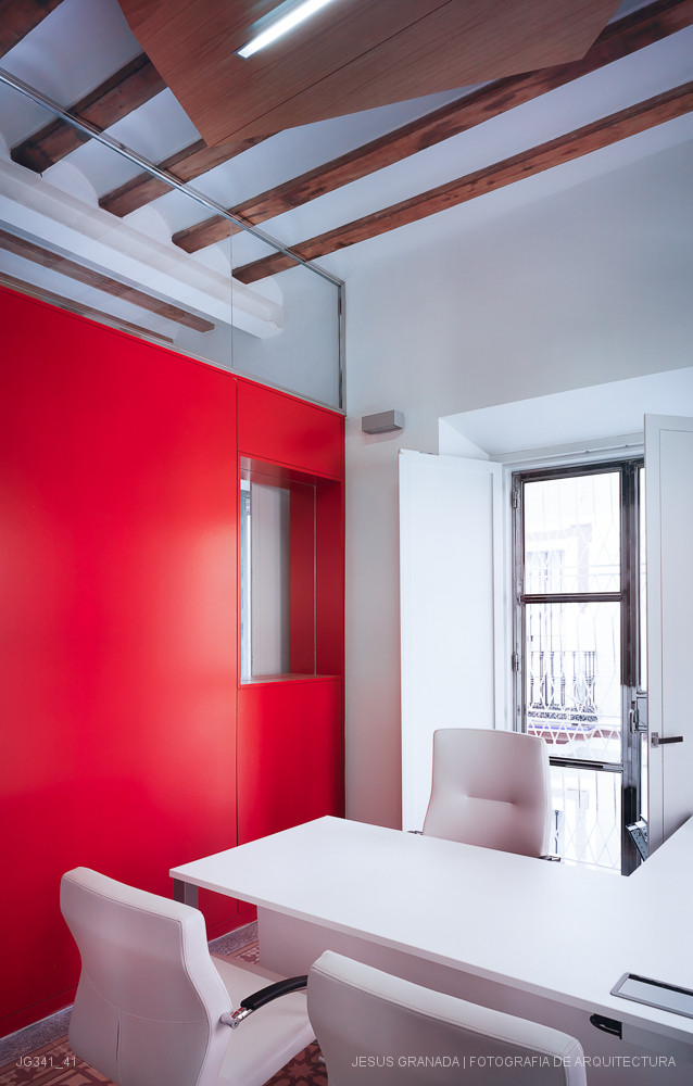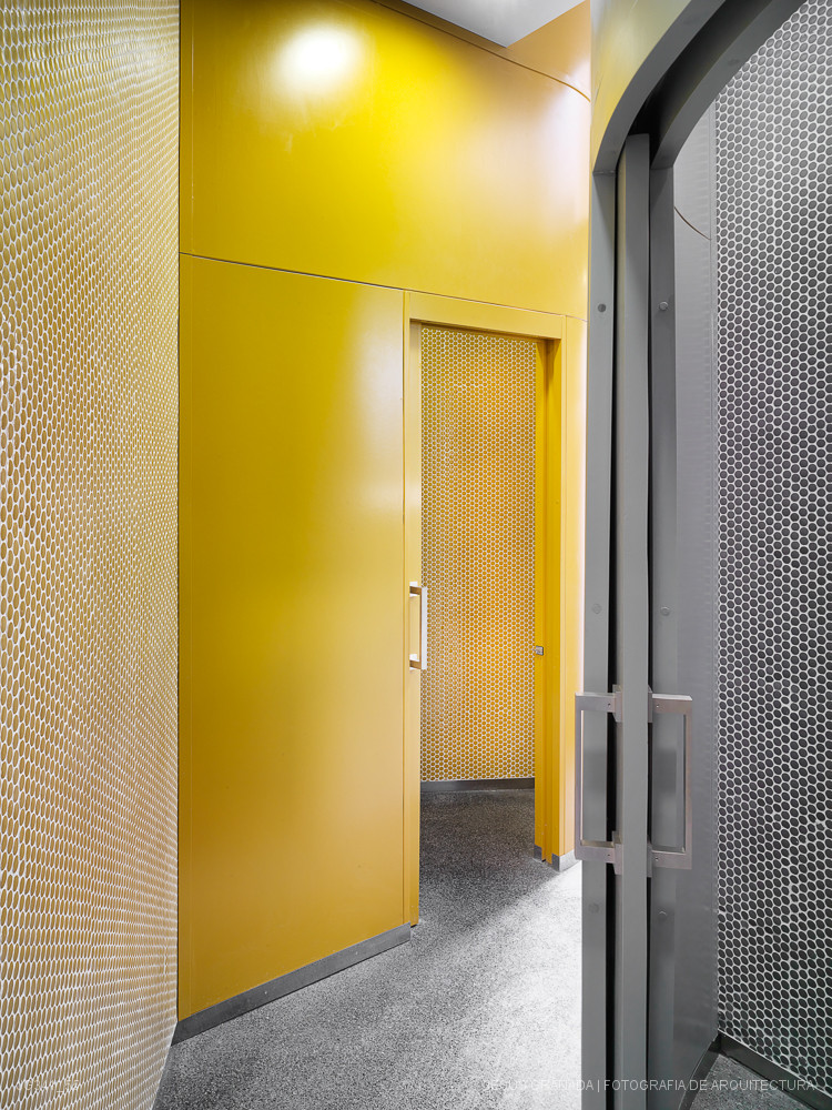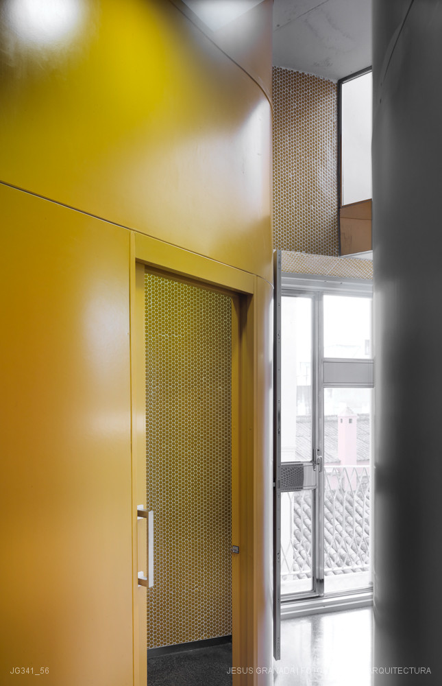 La actuación ha pretendido recuperar ese vínculo necesario y, hoy día, reivindicado de forma generalizada por el mundo laboral, entre el modo de habitar los espacios cotidianos asociados al trabajo y la arquitectura que se dispone para ello. Con tácticas que parten de la limpieza general y puesta en valor de los elementos significativos del edificio o que forman parte ya de la memoria reciente del sindicato, la actuación se centra en habilitar las exigencias del programa simbólico y administrativo de las distintas Fundaciones que vendrán a ocuparlo en un espacio de continuidad atmosférica, apenas diferenciado por unos muebles separadores. La transparencia y el tratamiento incisivo de la luz o la intencionada aparición del color (RAL 1001), como hechos diferenciales para cada uno de los ámbitos disponibles del edificio, serán los argumentos ambientales de estos diversos relatos que dan sentido a la nueva casa.