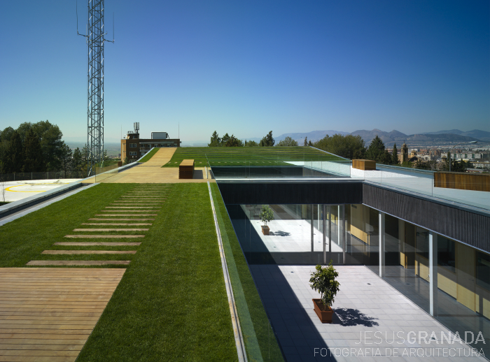 La entrada al vestíbulo principal del edificio, o sede conjunta del Instituto Andaluz de Geofísica y prevención de desastres sísmicos y del Centro de Coordinación de Emergencias 112-Andalucía, se produce por la cota superior del solar (+52.00 m. según el topográfico aportado en el concurso). Esta plataforma de entrada avanza hasta cubrir por completo el Centro de Emergencias 112, convirtiéndose en una terraza mirador hacia la ciudad; y que, además, con la construcción adecuada se convierte en una cubierta ajardinada como prolongación de la naturaleza exterior. La pieza del vestíbulo y zonas comunes se formaliza como un pórtico de hormigón visto con la máxima transparencia en sus planos verticales y con un espacio en doble altura, que permite el acceso a cada sede independientemente.