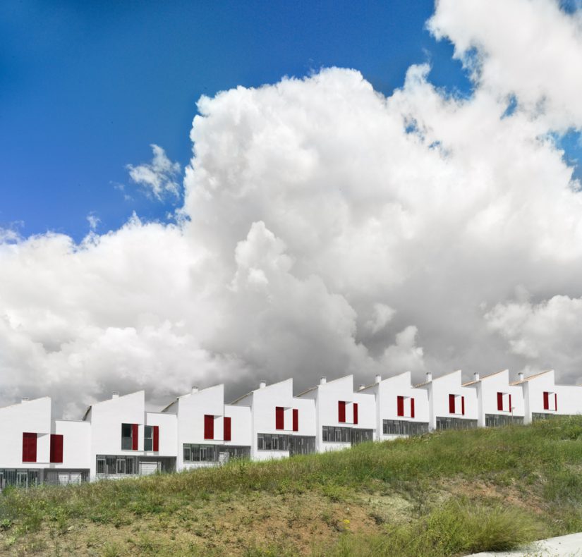 Utilizando los retranqueos de las fachadas y la alternancia de vacíos y llenos, se consigue jugar con las luces y las sombras de manera eficaz y rentable en estas latitudes. El mismo retranqueo permite que el conjunto se adapte naturalmente a la pendiente del terreno (que llega hasta casi los 6 metros de lado a lado). En los extremos oeste de cada solar el ritmo de fachada cambia para adaptarse a la singularidad del borde de cada intervención y se propone así un elemento como pausa o interrupción de cada serie. La teja y el color blanco de las paredes serán los acabados a elegir y ayudarán a integrar esta promoción en el bello conjunto de la villa de Iznájar.